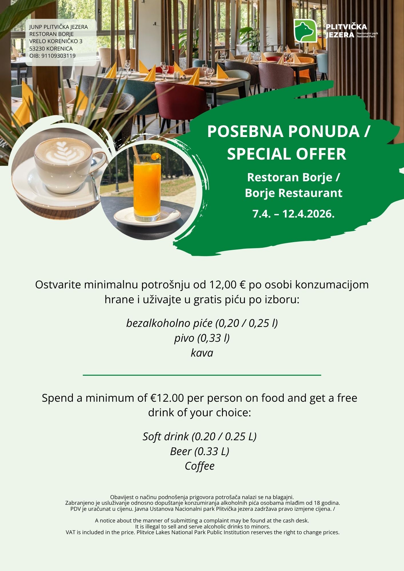 We especially highlight the restaurants Lička kuća, Poljana – Black River and Waterfall, where carefully created menus await you. At Borje Restaurant, every guest who spends a minimum of €12 per person is entitled to one complimentary drink of their choice – a soft drink (0.2/0.25 l), beer (0.33 l), or coffee. At the same time, all fast-food outlets, as well as Vučnica Bistro and Kozjak Café & Pastry, offer visitors a 15% discount on all food and beverage offer.