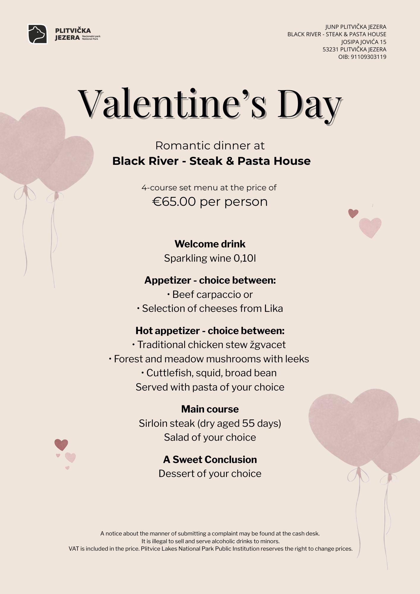 Valentine’s Day is the perfect opportunity to surprise your loved one in a special way, and Plitvice Lakes National Park provides the ideal setting for creating unforgettable moments together. Nested in the very heart of Croatia, the Plitvice Lakes offer more than just an excursion–they offer an experience of love in its most enchanting form. Enjoy the views from the lookouts over the untouched nature, walk along the paths along the lakes and waterfalls, settle into the comfort of the Jezero Hotel in the heart of the park and end the day with a romantic dinner with a welcome drink at the Black River Steak & Pasta House restaurant with sparkling wine included.