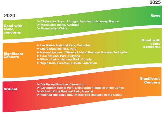 Kategorije (ili stupnjeve) pogleda na očuvanje određuje Međunarodna unija za očuvanje prirode (engl. International Union for Conservation of Nature – IUCN) i ima ih četiri: kritično stanje (critical), značajna zabrinutost (significant concern), dobro stanje uz određene zabrinutosti (good with some concern) i dobro stanje (good). Izvještaji o stanju očuvanja svjetske baštine donose se svake 3 godine od 2014. godine, međutim zadnji se izvještaj objavio nakon 5 godina odnosno upravo u listopadu 2025. godine.