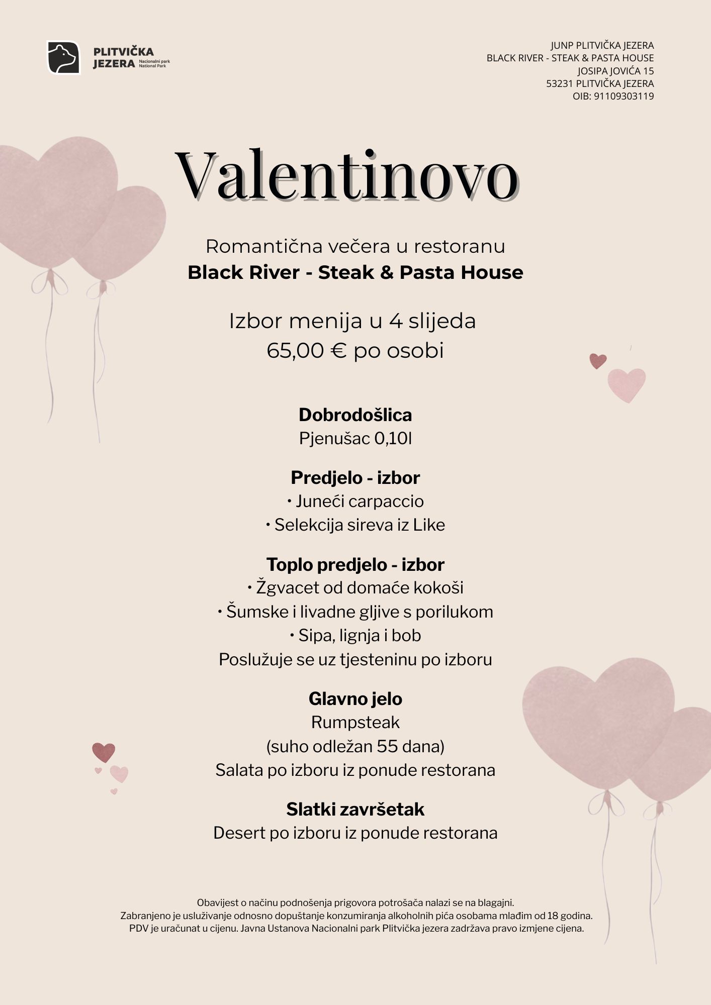 Romantična večera u 4 slijeda dostupna je i kao samostalna opcija za sve koji žele proslaviti Valentinovo uz poseban gastronomski doživljaj, u dva restorana – Black River Steak & Pasta House i Waterfall.